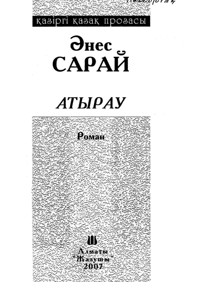 Атырау [Text], [Text] : роман / Сарай, Әнес, - Алматы : Жазушы, 2007 . - 526, [1] б.– (Қазіргі қазақ прозасы. - Қазақстан Республикасы Мәдениет және ақпарат министрлігі Ақпарат және мұрағат комитеті 017 "Әлеуметтік маңызды әдебиет түрлерін шығару" бағдарламасы - 2000 дана . – 978-601-200-034-4 (мұқ.) :Романда соғыс жылдарындағы балықшы ауылдың өмірі мен ондағы Абзал, Дауыл, Науат тәрізді қарапайым адамдардың сан тараулы тағдыр-талайы арқау болған